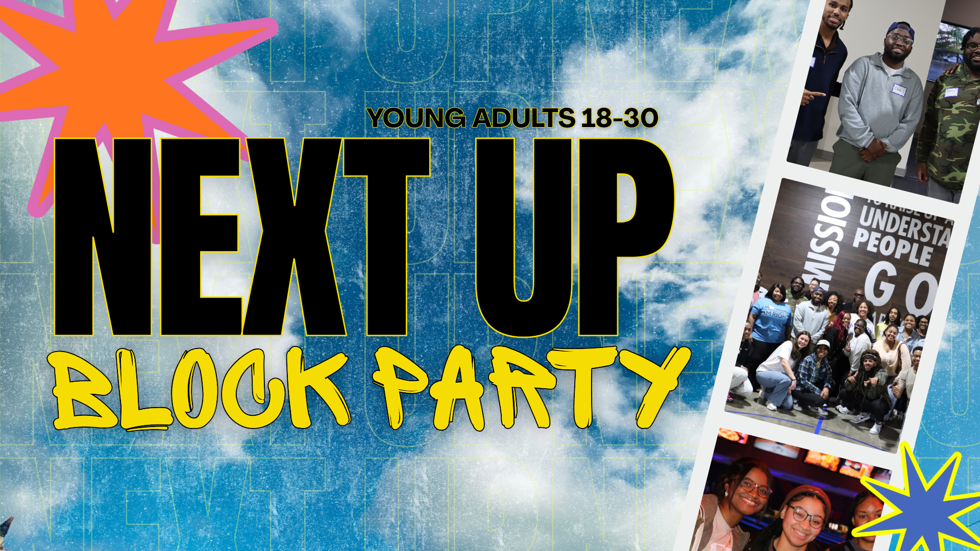 Join us for our Next Up Young Adults Block Party on Friday, May 22, at 6 PM! This free event is the perfect opportunity for young adults to connect, build community, and have fun. Enjoy catered BBQ, games, dancing, and much more.
